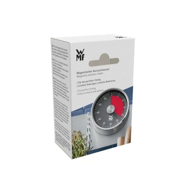 Магнитный кухонный таймер от WMF — это сочетание немецкого качества, продуманного дизайна и практичности. Чёткие отметки на шкале и красный клин позволяют легко определить оставшееся время. Максимальное время работы составляет 60 минут — идеально подходит для приготовления пасты, яиц, контроля времени отдыха дрожжевого теста и многого другого. Звуковой сигнал проинформирует вас о том, что установленное время истекло. Изготовлен из высококачественной нержавеющей стали и пластика.