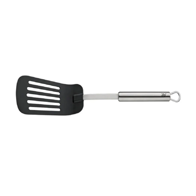 Кухонная лопатка WMF Profi Plus — это превосходный выбор для переворачивания на сковороде и подачи деликатных блюд, таких как рыбное филе, нежные овощи, тонкие блины или обычная яичница. Очень гибкая и тонкая лопатка бережно скользит под продуктом и не царапает антипригарное покрытие. Можно мыть в посудомоечной машине и удобно хранить на крючке благодаря практичной петле на ручке.