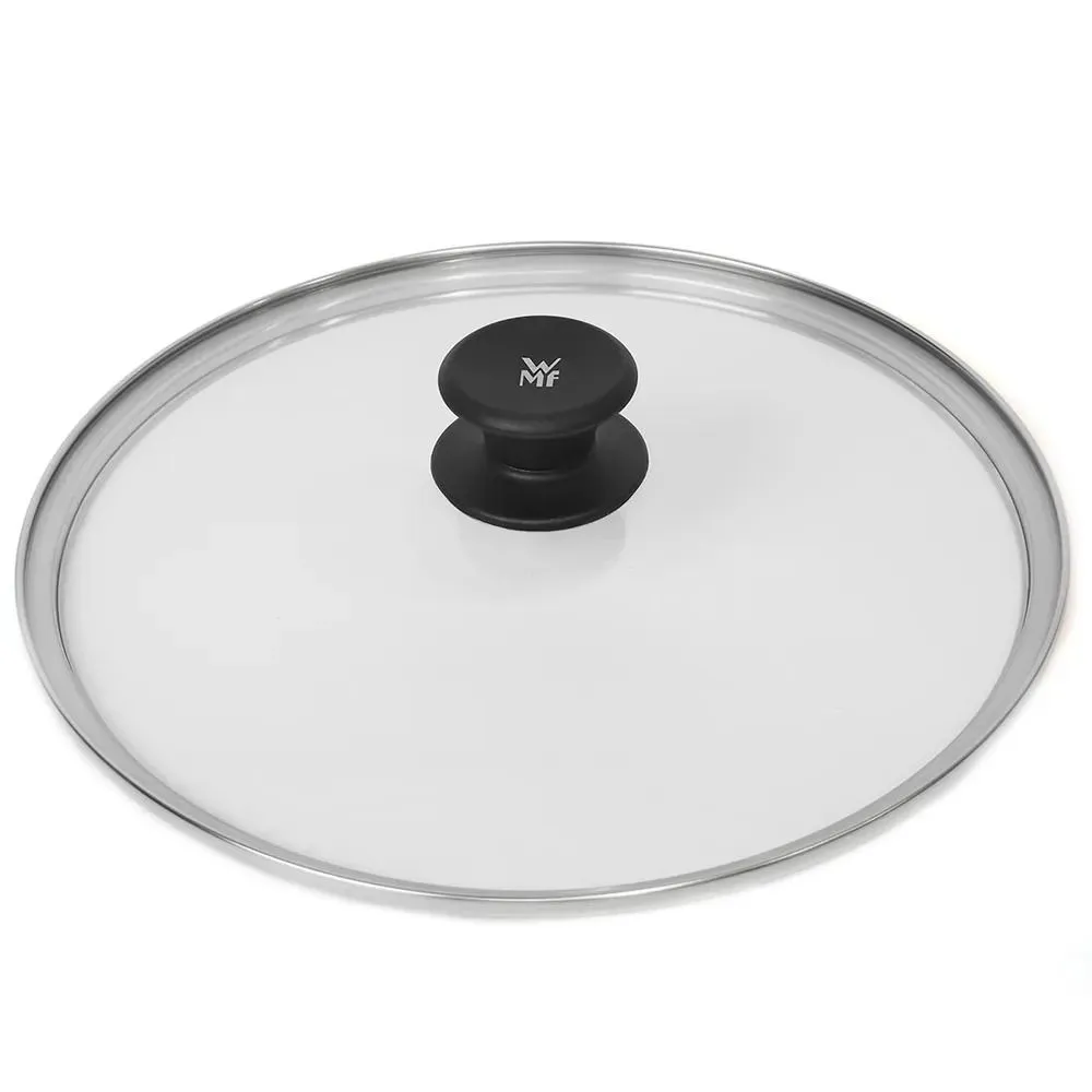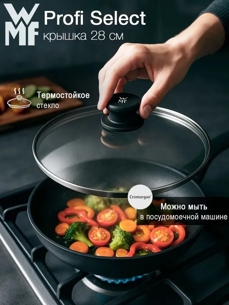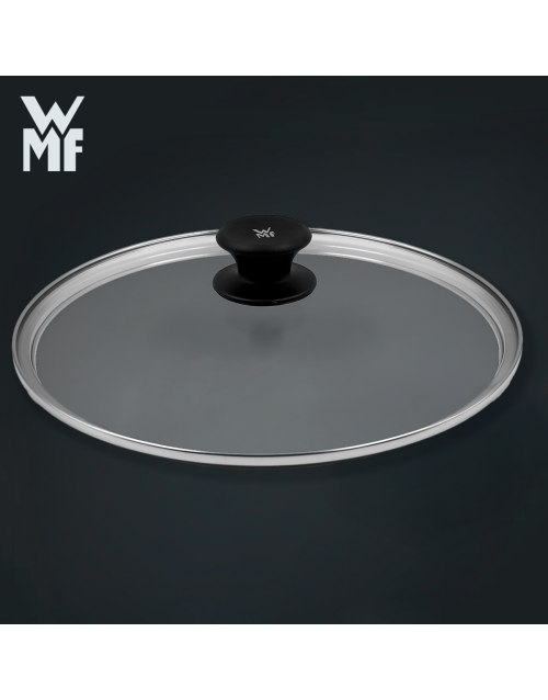 Крышка имеет края специальной формы, благодаря которым она плотно прилегает к сковороде. Из-за своего веса она надёжно и герметично закрывает сковороду, при необходимости её можно легко сдвинуть. Во время приготовления крышку можно поднимать за ручку из пластика, которая не нагревается. Изготовлена из прочной нержавеющей стали Cromargan и термостойкого стекла. Легко моется как вручную, так и в посудомоечной машине.