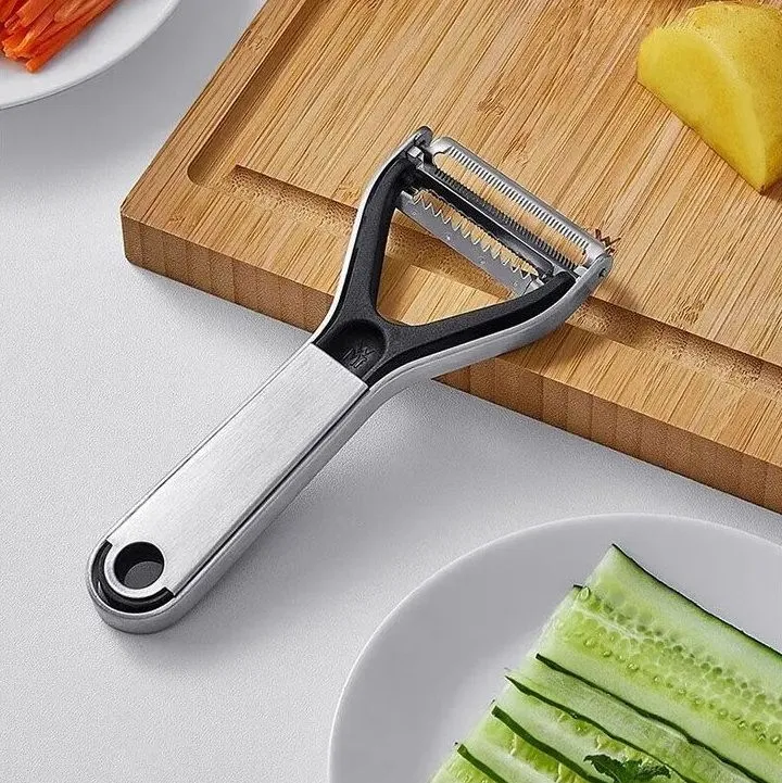Идеально подходящая для тонкой очистки овощей и фруктов, овощечистка WMF Gourmet 2-в-1 упрощает работу на кухне. От моркови и картофеля до спаржи, огурцов и других овощей — её лезвие легко скользит по самым неровным поверхностям, снимая лишь тонкий слой кожуры. Также оснащена дополнительной насадкой для нарезки соломкой. Изготовлена из материала Cromargan® и высококачественного пластика, подходит для мытья в посудомоечной машине.